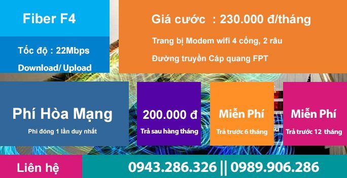 Dịch vụ Internet FPT : Là gói cước Internet Fiber F4 có tốc độ lên đến 27Mbps, quý khách có thể tham khảo chi tiết hơn về giá cước Fiber F4 ( tại đây ) . Ngoài ra , gói cước Fiber F4 có độ ổn định cao, phù hợp với khách hàng là gia đình ( khoảng 5 người ( mỗi người sử dụng ít nhất 2 thiết bị như điện thoại, máy tính bảng, máy tính cá nhân… )