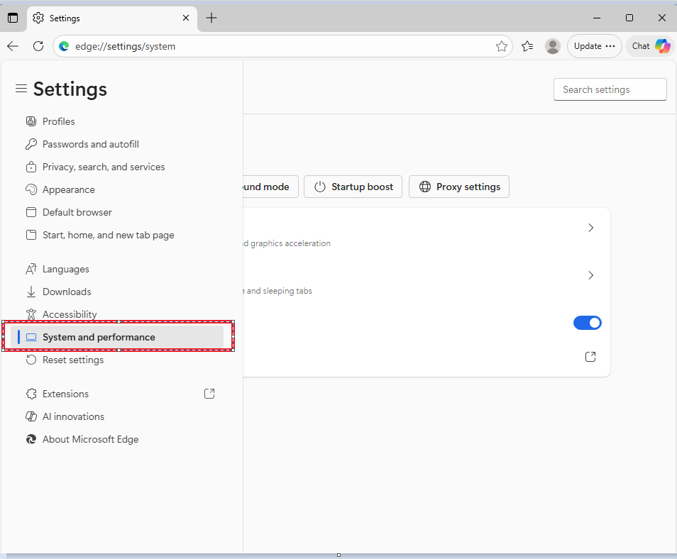 Bước 3: Ở thanh menu bên trái, tìm và chọn mục Hệ thống và hiệu suất (System and performance). Nếu không thấy, bạn có thể nhập từ khóa “acceleration” vào ô tìm kiếm trong phần Cài đặt.