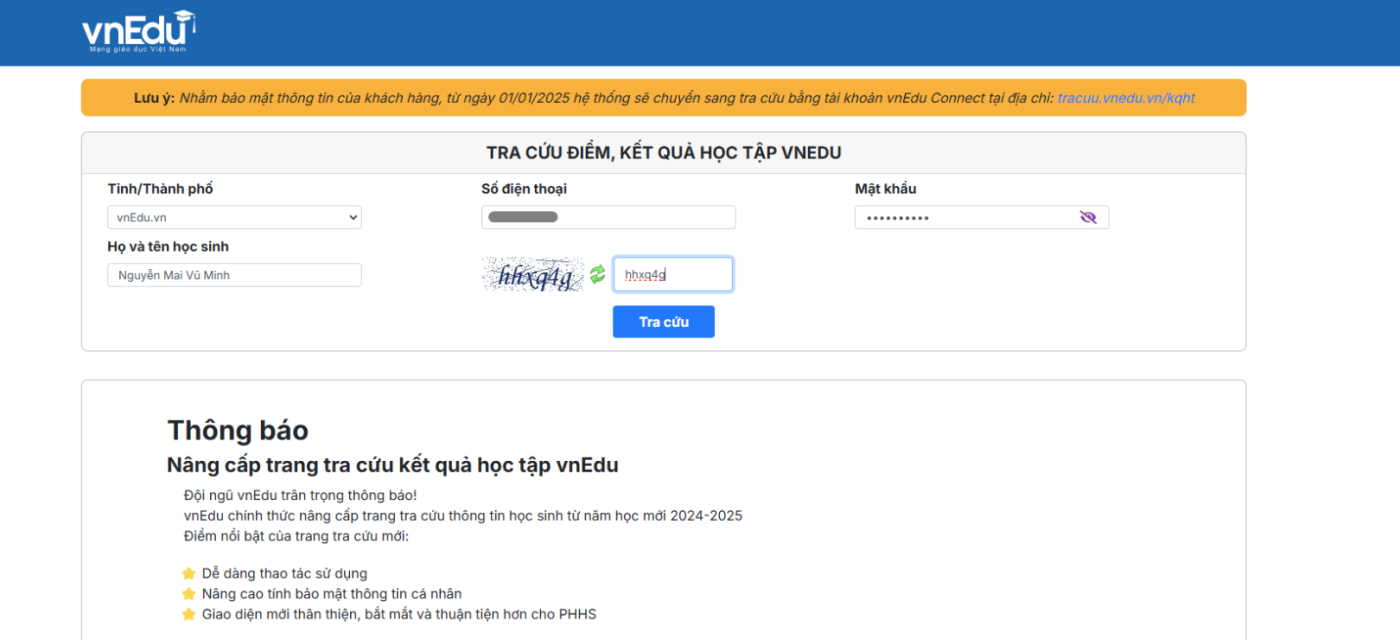Thông báo: Nâng cấp trang tra cứu kết quả học tập vnEdu